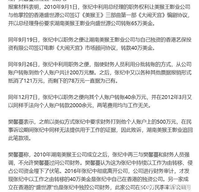 樊馨蔓称,2010年湖南美猴王公司成立之后,张纪中再三与樊馨蔓和财务人员强调,不允许樊馨蔓过问公司财务。2016年张纪中彻底离开公司,公司进行财务审计,才发现张纪中以工作之由转移的40万美金是张纪中自己在香港的独资公司。另一家成立在香港的“盛世源”也是张纪中独控公司财务,此家公司在500万民事案诉讼期间还存在,目前报案之时发现香港“盛世源”公司已经注销。